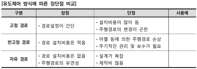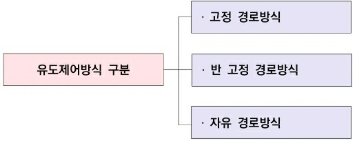 유도제어 방식에 따라서는 1) 주행면에 설치된 고정경로를 이용하는 고정 경로방식, 2) 주행 경로의 중간 중간에 설치된 위치마크를 인식하면서 움직이는 반 고정 경로방식, 3) 외부 및내부의 센서를 이용해서 임의의 경로를 주행할 수 있는 자유 경로방식으로 분류할 수 있다.