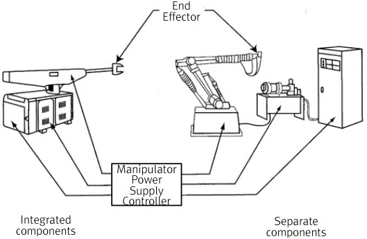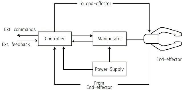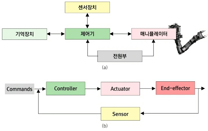 1) 매니퓰레이터(기구부: Manipulator): 링크 및 관절로 구성된 로봇의 몸체.